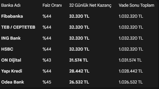(Not: Net kazanç hesaplamaları bankaların uyguladığı vergi ve işlem ücretlerine göre küçük değişiklikler gösterebilir.)