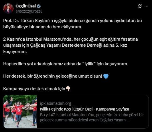 CHP Genel Başkanı Özgür Özel, 2 Kasım Pazar günü gerçekleşecek İstanbul Maratonu’na dair resmi hesabından paylaşım yaparak, “Prof. Dr. Türkan Saylan’ın ışığıyla binlerce gencin yolunu aydınlatan bu büyük aileye bir adım da ben ekliyorum. 2 Kasım’da İstanbul Maratonu’nda, her çocuğun eşit eğitim fırsatına ulaşması için Çağdaş Yaşamı Destekleme Derneği adına beşinci kez koşuyorum. Hapsedilen yol arkadaşlarımız adına da ‘iyilik’ için koşuyorum. Her destek, bir öğrencinin geleceğine umut olsun” dedi.